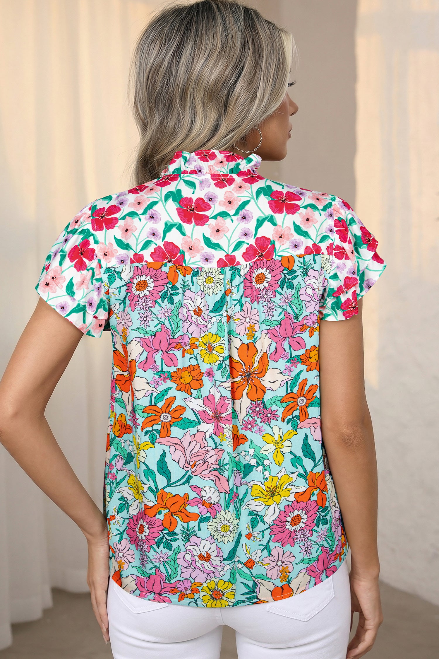 Sky Blue Floral Print Split Neck Button Front Flutter Sleeve Blouse